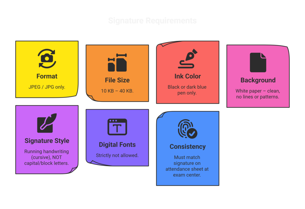 Your signature must be done on plain white paper using a black or dark blue pen. Scan or photograph it clearly before uploading. The requirements are: