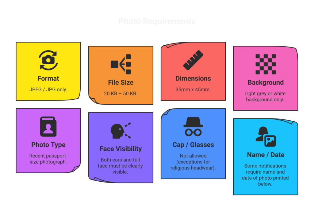 Important: Your photograph must be recent, ideally taken within the last three months. The same photo must be used consistently across your application form, admit card, and document verification. Do not use edited, filtered, or digitally altered backgrounds unless it closely resembles a natural white or light grey studio background.